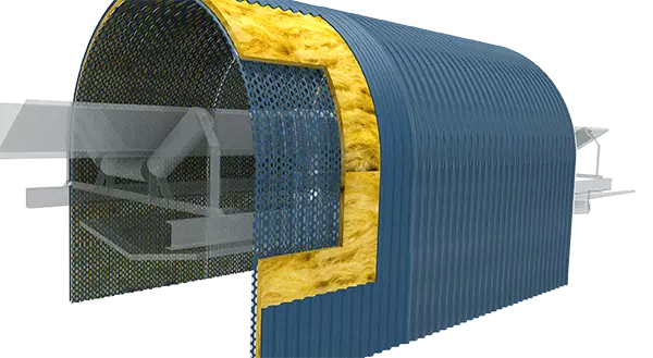 Die besten Materialien. Die Wand enthält Tausende von kleinen Löchern, die die Schallwellen durchlassen und verhindern, dass der Lärm durch den Rückpralleffekt verstärkt wird. Die mittlere Schicht enthält das schallabsorbierende Material zur Verringerung der Bandgeräusche; die Dicke hängt von der Geräuschemission und der für das Förderband erforderlichen Reduzierung ab. Die äußere Abdeckhaube verhindert, dass Geräusche nach außen dringen und schützt das Innere des Gürtels vor Regen, Wind und Sonne. Das System bietet außerdem eine absolut sichere Installation gegen die Risiken und Gefahren, die mit Förderbändern verbunden sind.